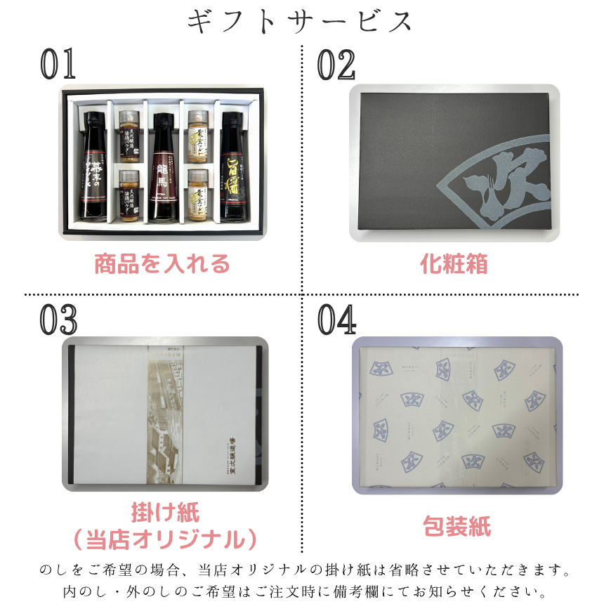 伝統と革新が凝縮された無添加商品が化粧箱に入っており、贈答用としても最適です。
