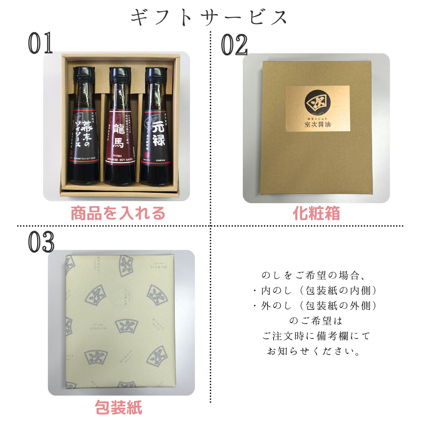 450年の歴史を持つ老舗醤油屋「室次」がこだわり続ける天然醸造しょうゆ3種を、 手土産に最適な詰め合わせにしました。原料は全て福井県産、江戸時代からの伝統製法で1年じっくり発酵・熟成させる天然醸造しょうゆ3種を、気軽にお楽しみ下さい。